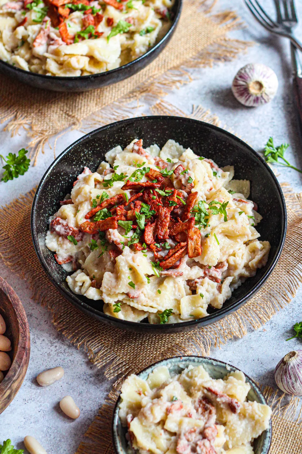 Deze gezonde pasta carbonara combineert romige bloemkoolsaus met cannellini bonen en hartige vegan spekjes voor een verrassende plantaardige twist. De saus wordt in de keukenmachine glad gemixt met amandelmelk en edelgistvlokken, terwijl de spekjes krokant worden gebakken voor extra textuur en umami. Snel en smaakvol, ideaal als doordeweekse maaltijd of als lichte maaltijd in lente en zomer waar comfort en gezondheid samenkomen.