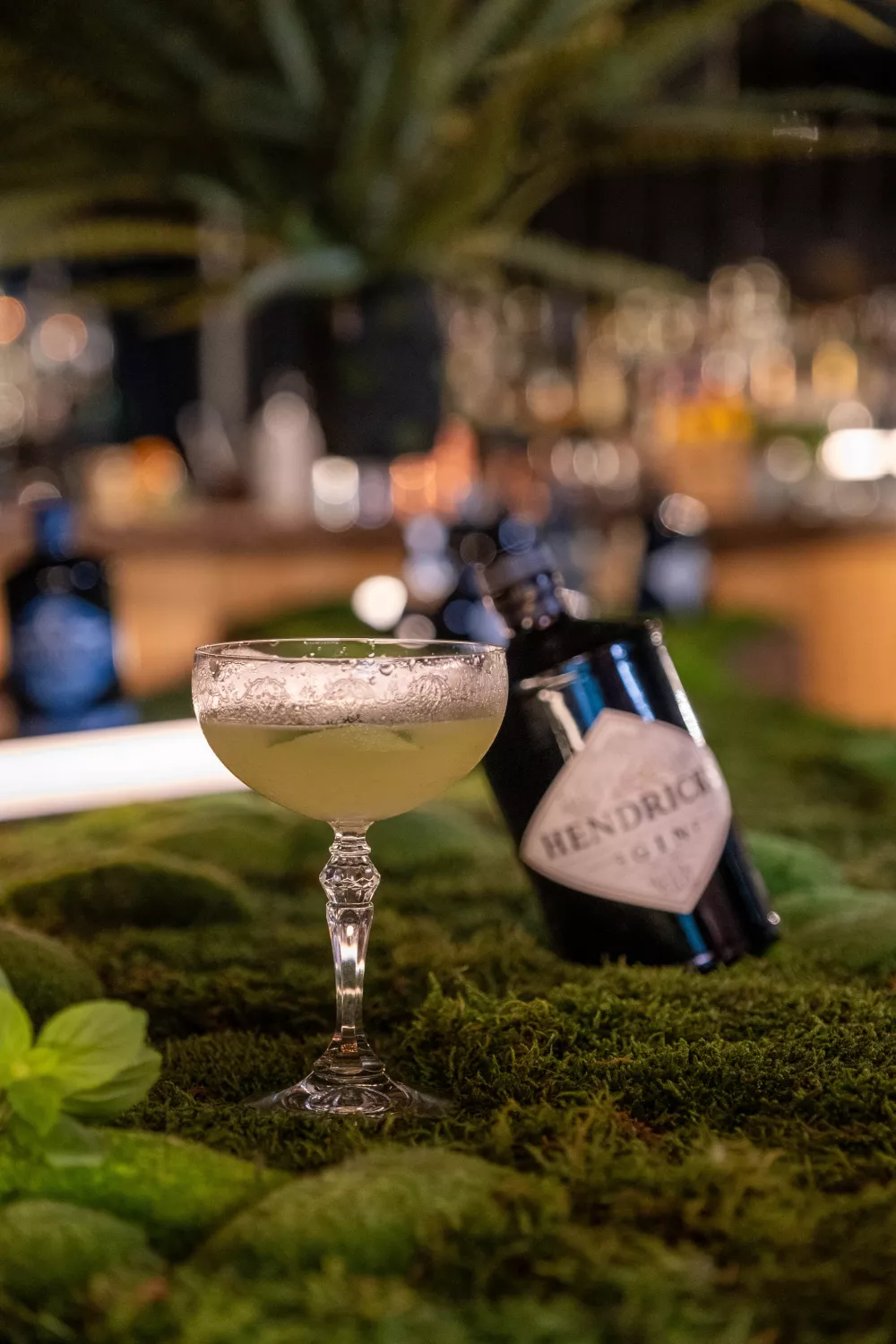 Neem dan een shaker en doe er 5 centiliter Hendrick’s gin, 2,5 centiliter vers geperst citroensap en 1,5 centiliter double syrup in.