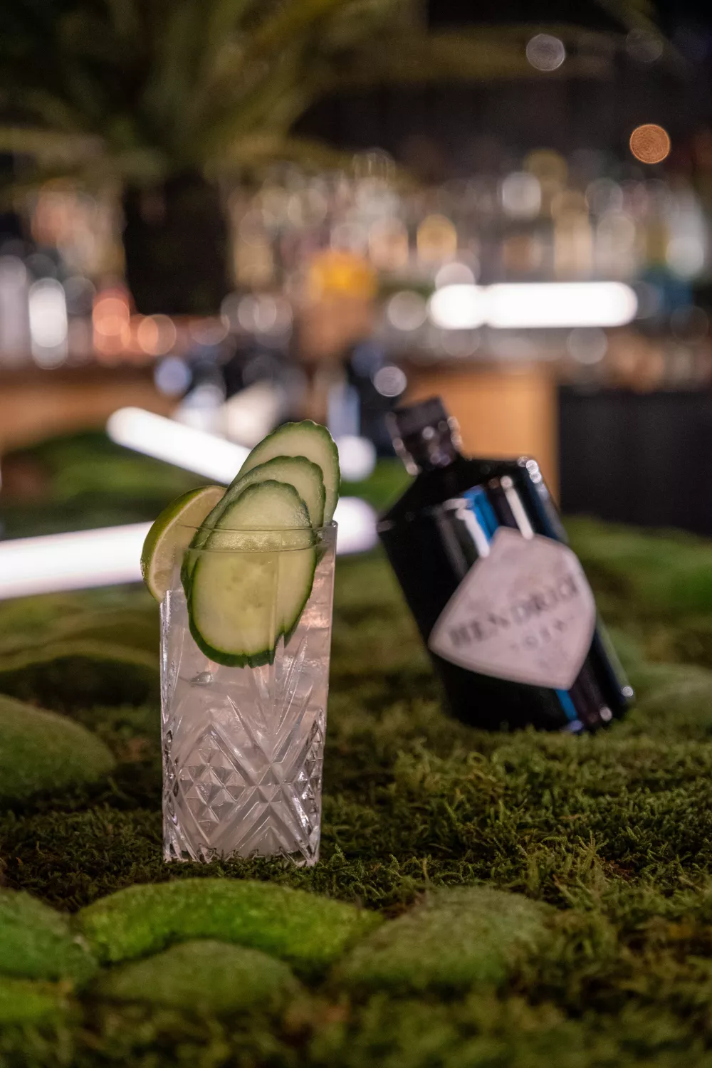 Vul een highball glas met ijs. Voeg er de Hendricks Gin, vers geperst limoensap en suikersiroop aan toe. Top met ginger beer en garneer het glas met drie dunne schijfjes komkommer en een partje limoen.