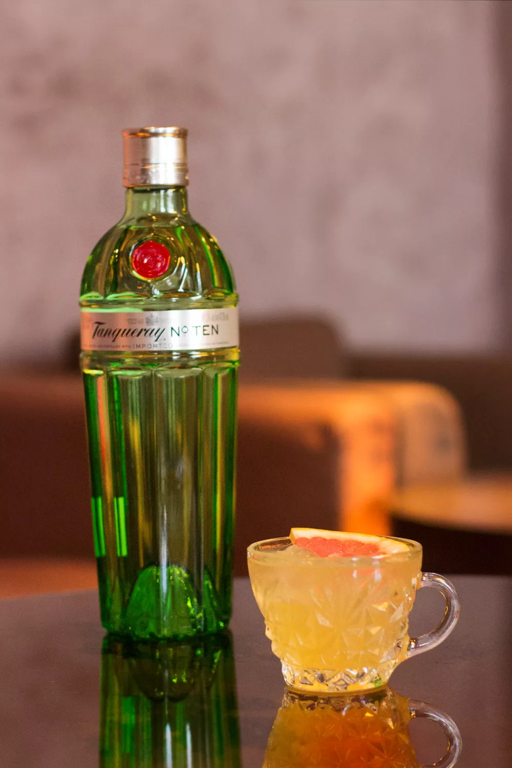Neem een shaker en doe hierin de Tanqueray Ten gin, de Dry Curacao, de Oleo Saccharum en de gekoelde kamillethee. Voeg ijs toe en schenk de cocktail van de ene shakerhelft naar de andere tot beide helften goed koud zijn.