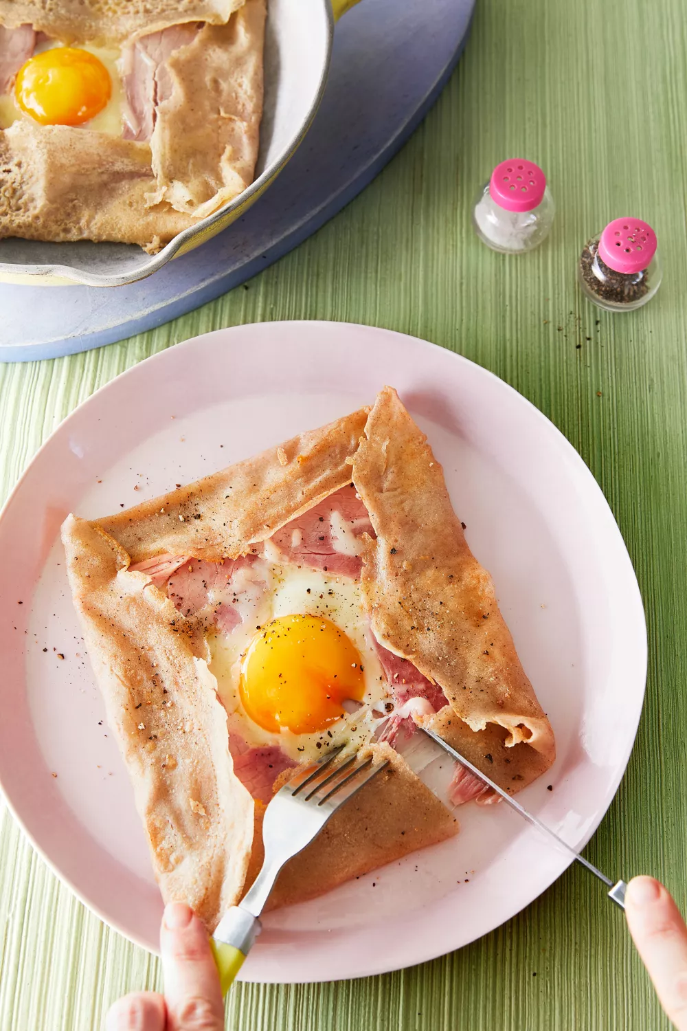 Bak de galette 15-20 seconden en zet het vuur op matig. Breek er in het midden een ei boven en verdeel het eiwit met een vork zo dat het zoveel mogelijk van de galette bedekt.