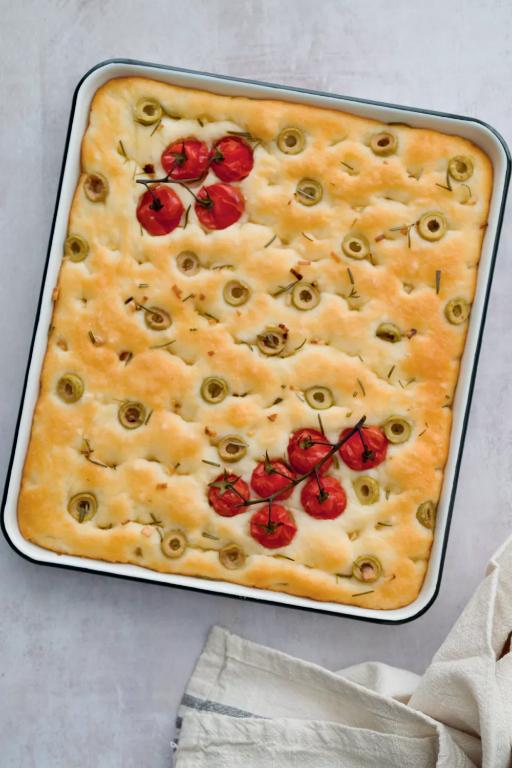 Bak de focaccia in ongeveer 25 minuten gaar en goudbruin. De exacte tijd hangt af van de grootte van de bakvorm. Laat de focaccia afkoelen op een rooster en dek hem daarna goed af zodat hij niet uitdroogt.