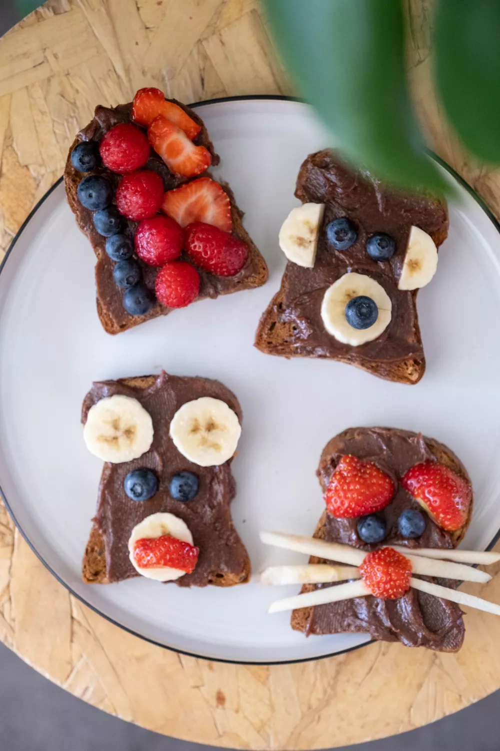 Rooster het brood in een toaster. Smeer een dikke laag choco op elke toast en versier met het fruit.