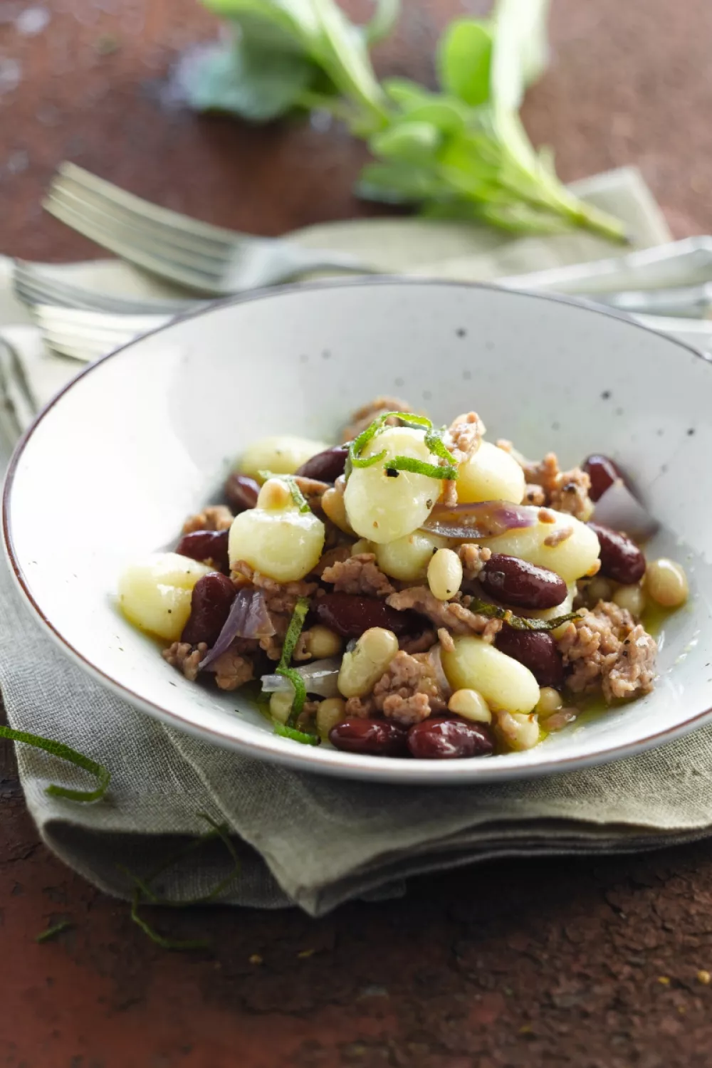 Romige gnocchi met kruidig gehakt en een mix van witte en rode bonen, versterkt door droge sherry en frisse salie. Het gehakt bak je kort en blus je met sherry, de gnocchi kook je tot ze boven drijven en je schept alles samen om af te werken met een klontje boter. Een snelle, vullende panmaaltijd voor doordeweekse avonden.