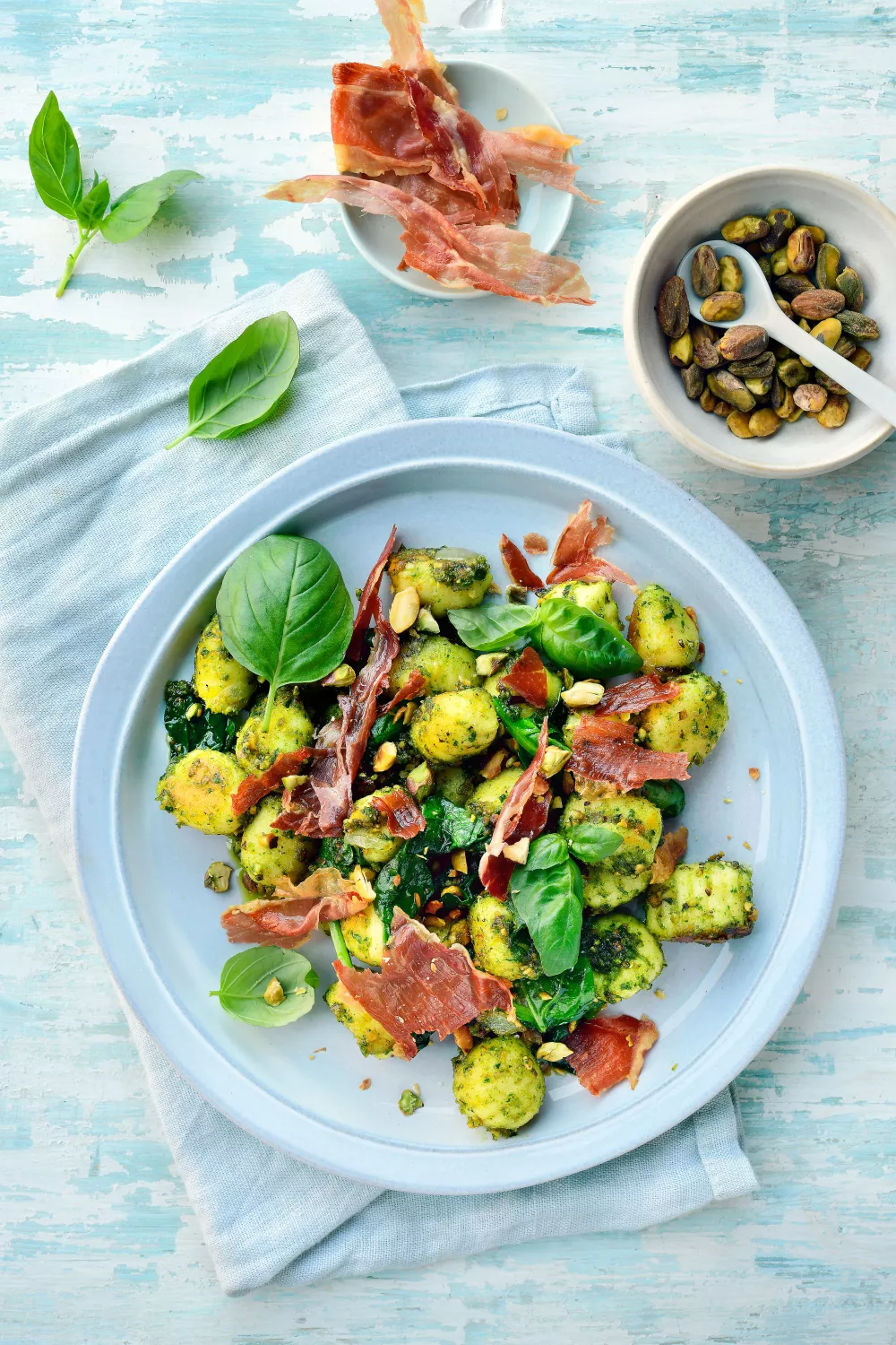 Goudbruine gnocchi met een nootachtige pistachepesto, krokante Parmaham en licht geslonken spinazie is een snelle smaakmaker voor lunch of doordeweeks diner. De pesto wordt fijngemalen in de keukenrobot en de ham in de oven extra krokant gemaakt, waarna de gnocchi in de pan aanbakt tot hij mooi kleurt. Werk af met verse basilicum voor een frisse, mediterrane toets.