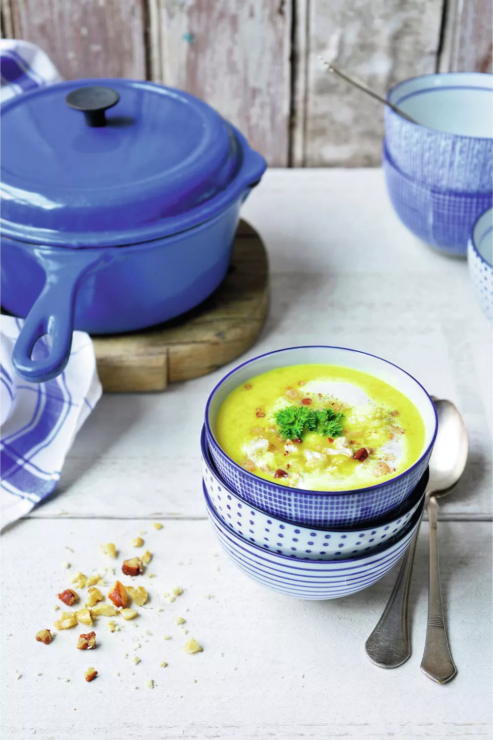 Romige bloemkoolsoep met goudgeroosterde roosjes, kokosmelk en warme kurkuma biedt een troostrijke smaak met een subtiele Aziatische toets. Door de bloemkool te roosteren en de soep te pureren ontstaat een diepe, nootachtige laag die nog wordt versterkt door verse gember, witte miso en een scheutje ahornsiroop. Serveer met krokant geroosterde noten en peterselie als warm voorgerecht of gezellig hoofdgerecht voor koude herfst- en winteravonden.