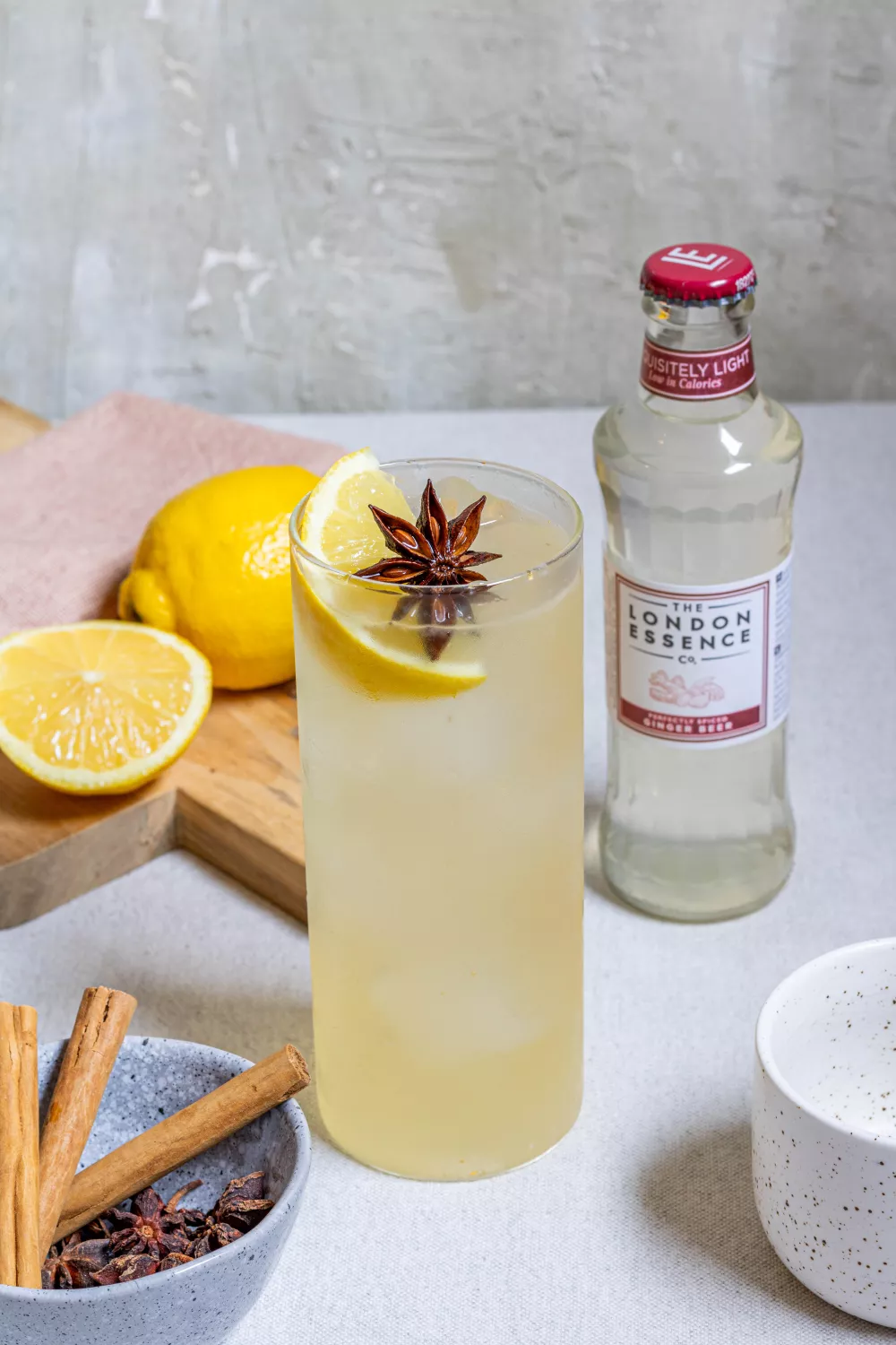 Schenk het ginger beer erbij en roer kort door. Garneer met een partje citroen en steranijs.