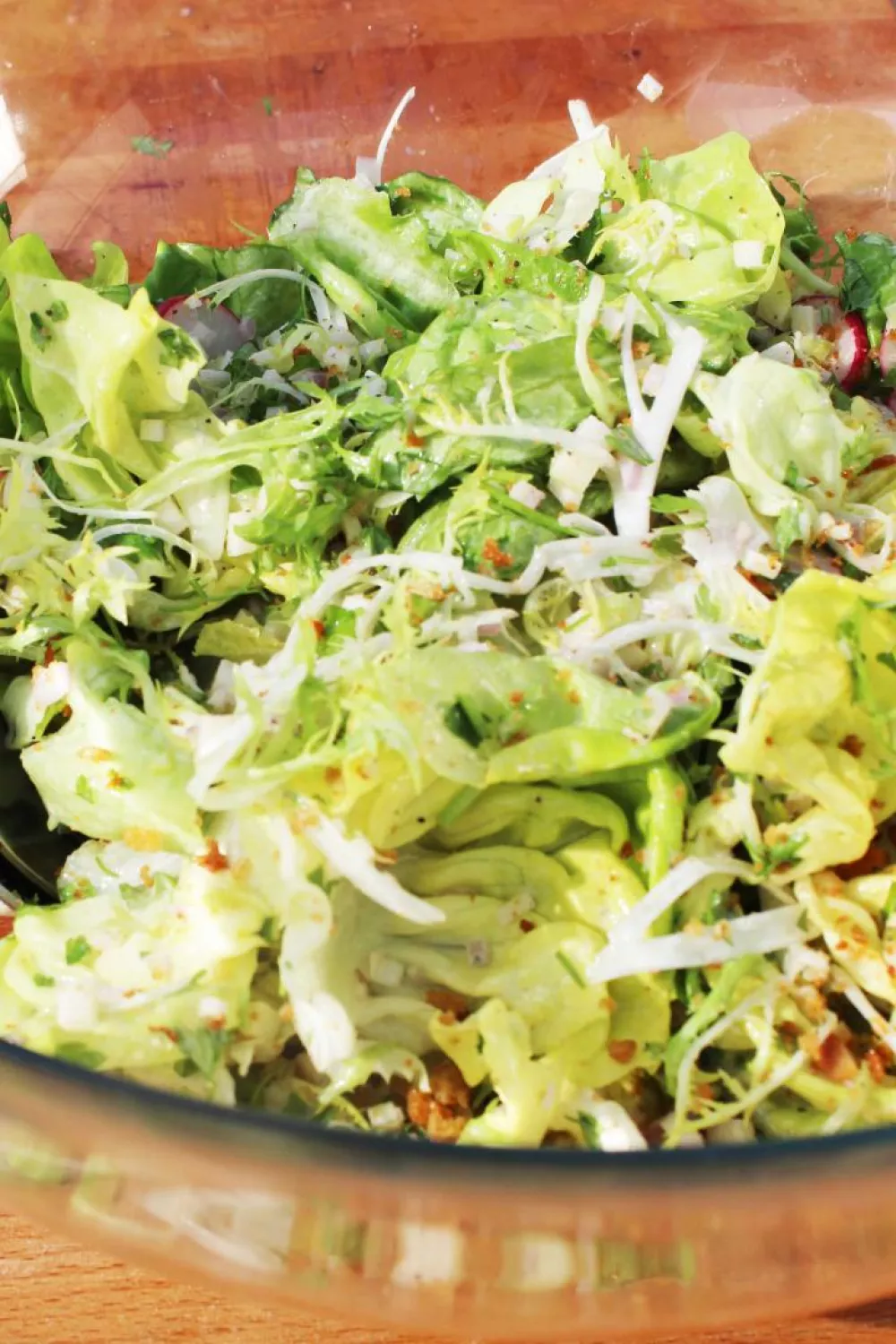 Knapperig slahart en fris frisée vormen de basis van deze lichte groene salade met dragonmayonaise. Fijne sjalot, kervel en radijs geven pep en frisheid en broodcroutons zorgen voor lekkere bite, terwijl romige mayonaise met dragonazijn de salade een subtiele aromatische toets geeft. Snel te maken als zomerse starter of lichte lunch door de dressing te mengen en alles goed te husselen voor het serveren.