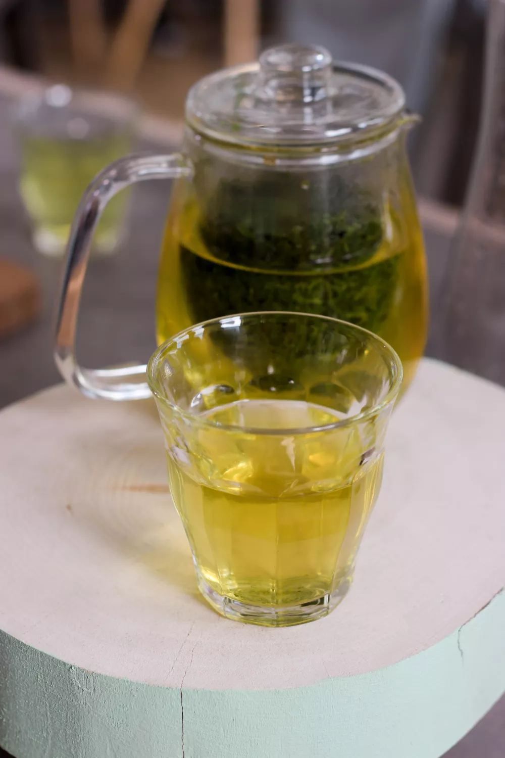 Breng het water aan de kook en laat het afkoelen tot 65 graden. Voeg de groene thee toe en laat 3 minuten trekken.