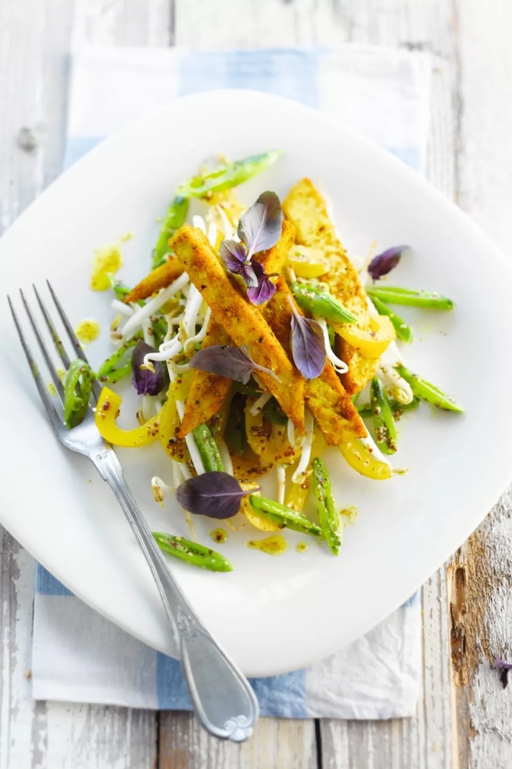 Knapperig gebakken quornfilets met een kleurrijk palet van peultjes, sojascheuten en gele paprika vormen een lichte, hartige vegetarische schotel. De quorn wordt kort gemarineerd en krokant gebakken, terwijl de groenten fris worden aangemaakt met graanmosterd en witte wijnazijn. Perfect voor een snelle doordeweekse lunch of een zomerse avondmaaltijd, eenvoudig af te werken met verse kruiden.