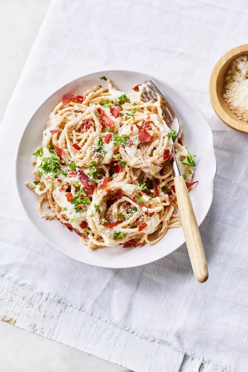 Deze groenterijke pasta carbonara combineert romige knolselderpuree met gesmolten kaas, spaghetti en krokante zwartewoudham voor een hartig en troostrijk bord. De knolselder wordt gekookt en gepureerd met melk tot een fluweelzachte saus, terwijl de ham snel krokant gebakken of in de microgolfoven opgewarmd wordt. Perfect als snelle doordeweekse maaltijd of verwarmend comfortfood in de herfst en winter, met een vleugje nootmuskaat voor extra diepte.