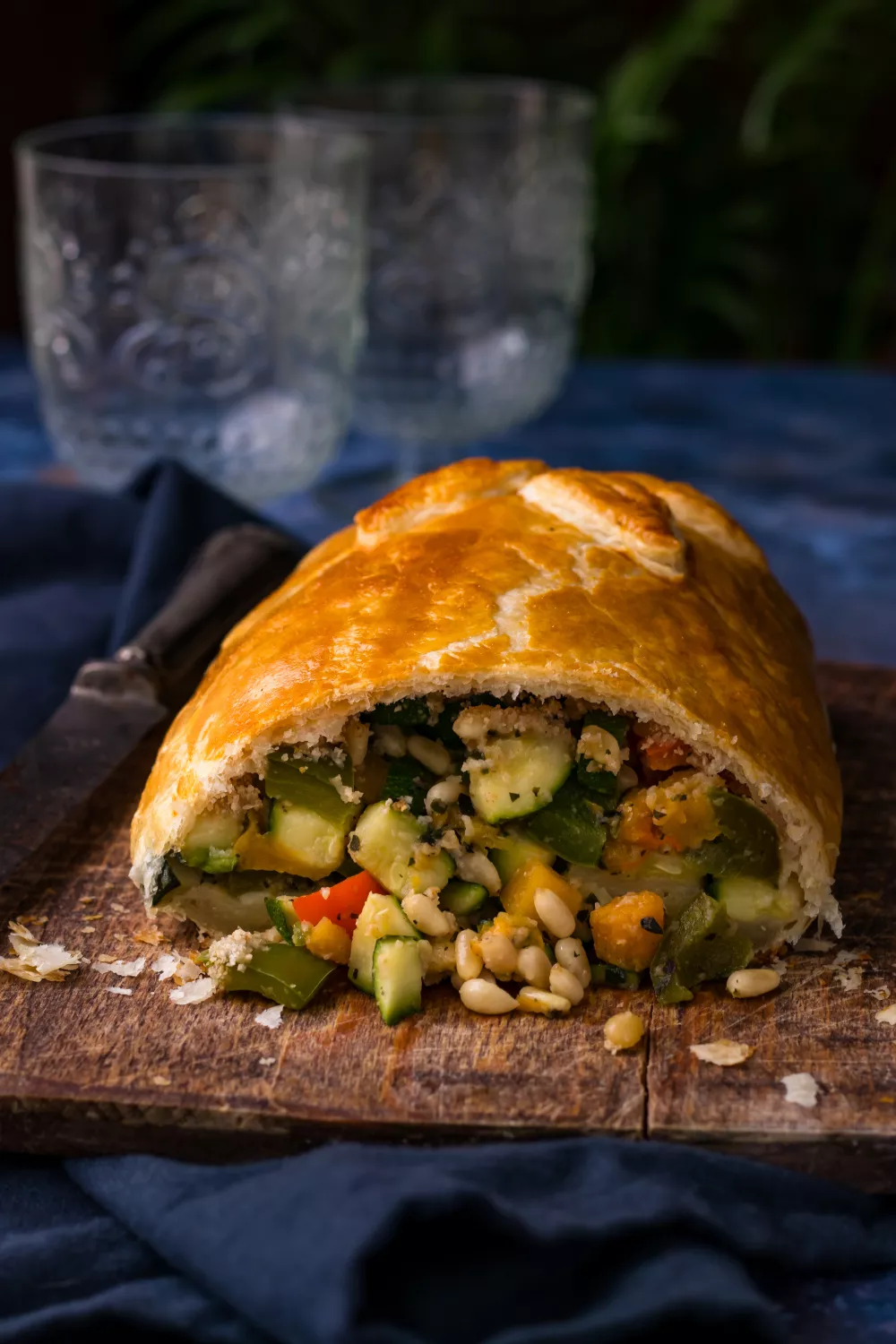 Schep het groentemengsel in het midden en vouw het bladerdeeg dicht om de vulling; vouw eerst de zijkanten en daarna de lange kanten. Draai de strudel om zodat de naad naar beneden ligt.
