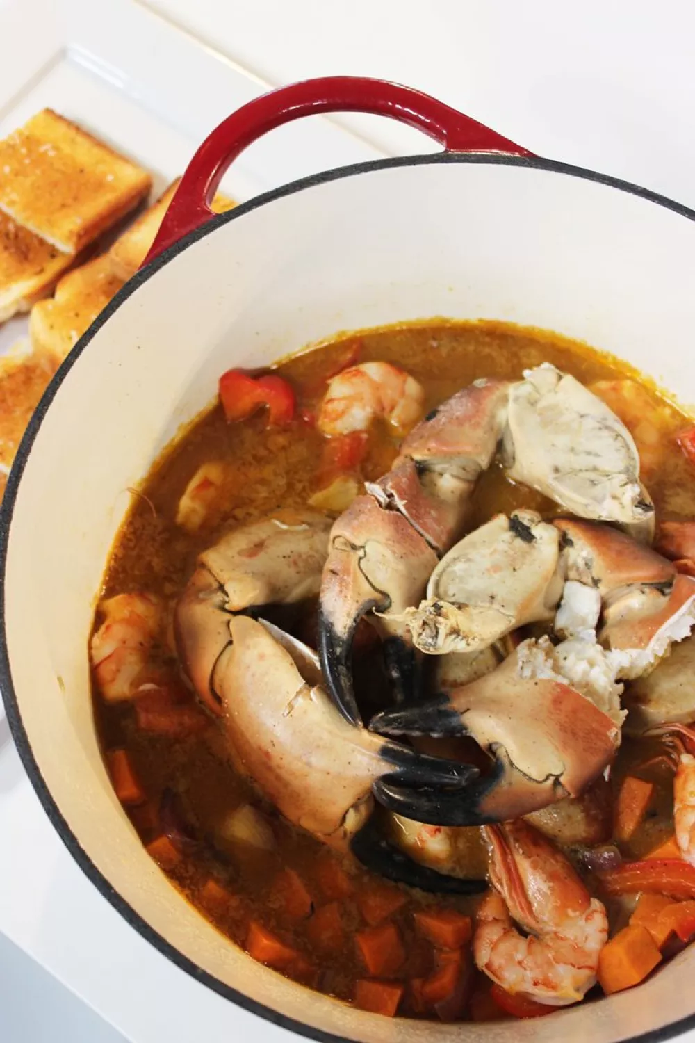 Zeef de garnalenbouillon. Voeg de gamba’s, de beuling, de krabbenpoten en als laatste de garnalenbouillon bij de groenten. Laat zachtjes koken onder deksel.