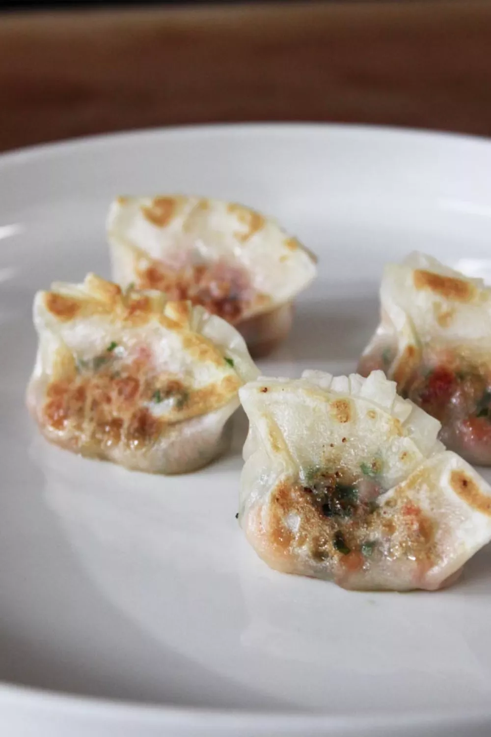 Knapperige gyoza gevuld met verfijnd kreeftenvlees, subtiel op smaak gebracht met in azijn opgelegde gember, in olijfolie opgelegde groene peper en fijngehakte peterselie. Door ze eerst goudbruin te bakken en vervolgens kort te stomen ontstaat een krokante onderkant en een sappige binnenkant. Ideaal als elegant voorgerecht of luxe borrelhapje bij een zomerse of feestelijke maaltijd.
