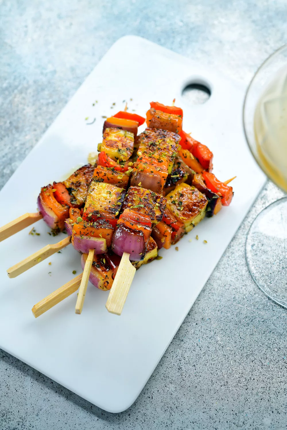 Prik de kaas en de groenten op de houten stokjes. Verwarm een scheutje olie in een grillpan op het vuur. Leg er de prikkertjes in en laat ze goudbruin bakken (ca. 3 minuten aan elke kant). Bestrijk de spiesjes tijdens het grillen met de resterende marinade uit de kom.