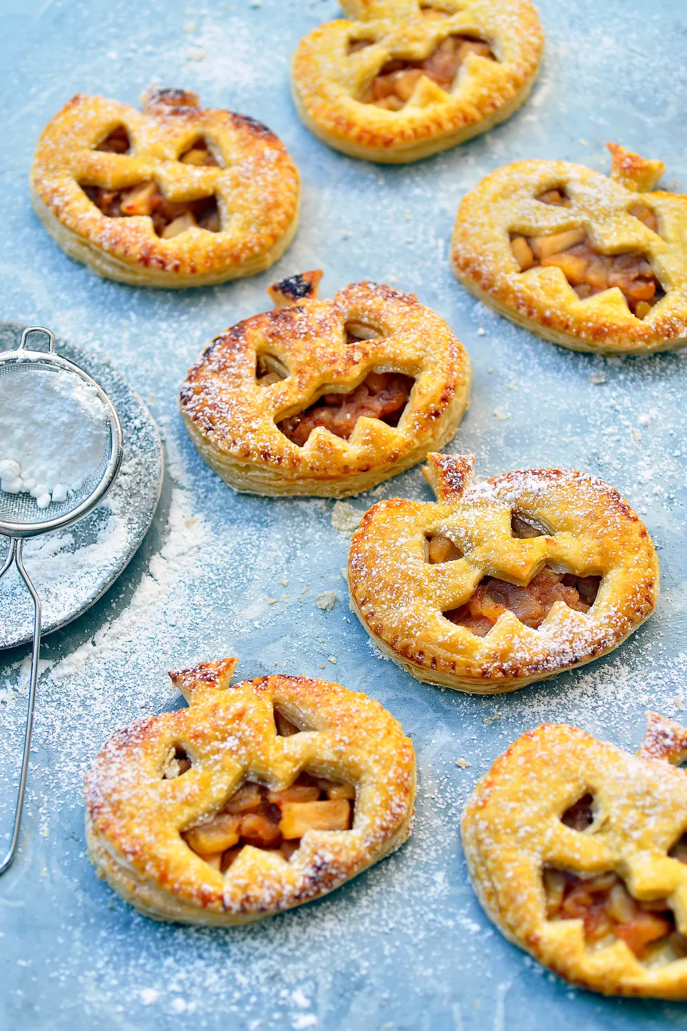 Maak deze speelse Halloween appelflappen met sappige appels, warme kaneel en knapperig bladerdeeg. Stoof de appelblokjes met suiker en citroensap tot een volle, smeuïge vulling, steek pompoenvormen uit het bladerdeeg en geef ze een vrolijk of griezelig gezichtje. Een snel en gezellig herfstgebakje om warm uit de oven te serveren bij traktaties, borrels of als zoete snack.