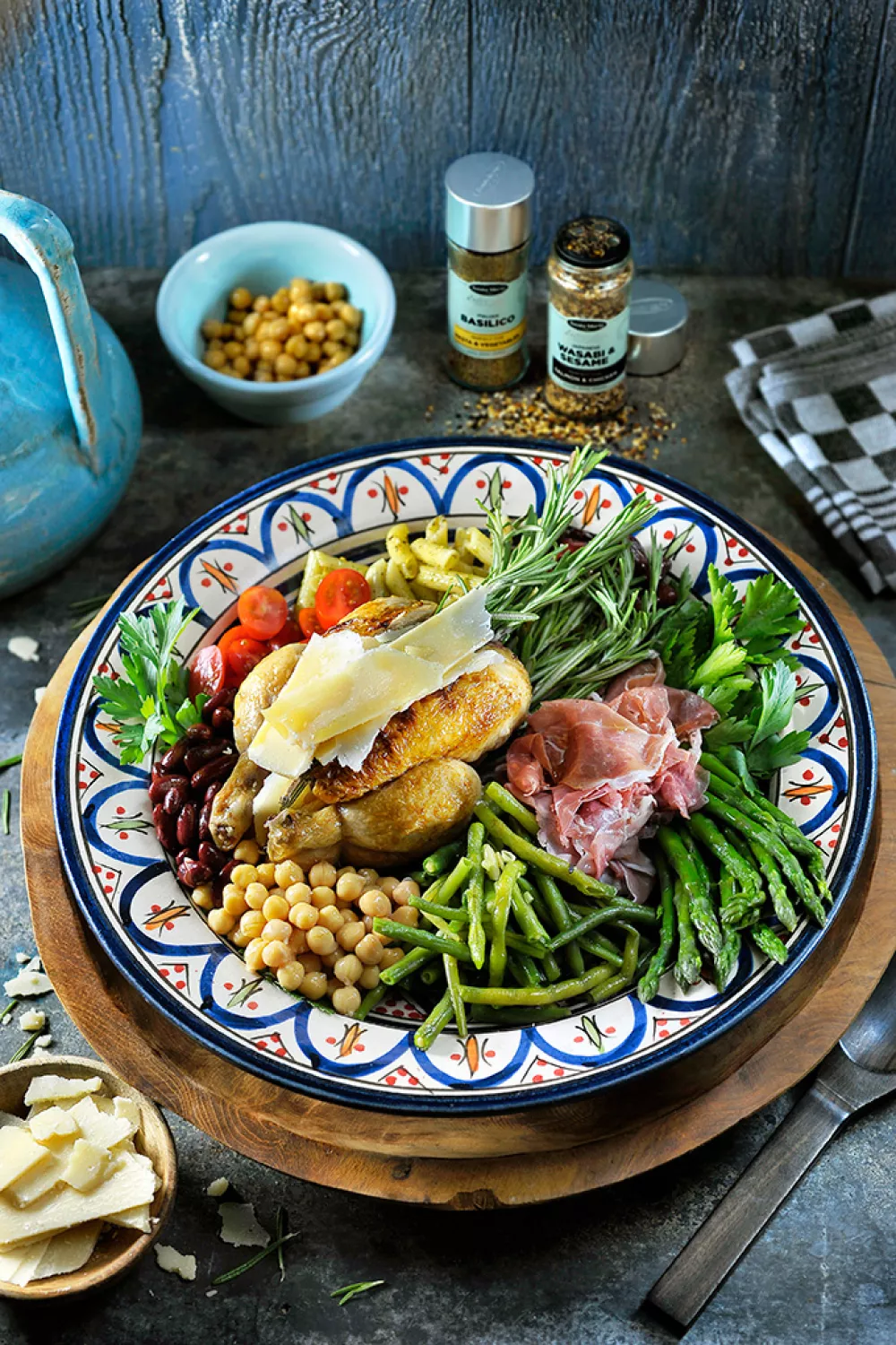 Leg een bodempje grof gesneden kropsla en enkele tomaatjes op de bodem van een grote platte schaal. Schik daar de gekookte groenten op. Leg bovenop de warme haantjes en de prosciutto. Rasp er flink wat pecorinokaas over en lepel er, als laatste, de viniagrette over. Serveer de patatine apart.