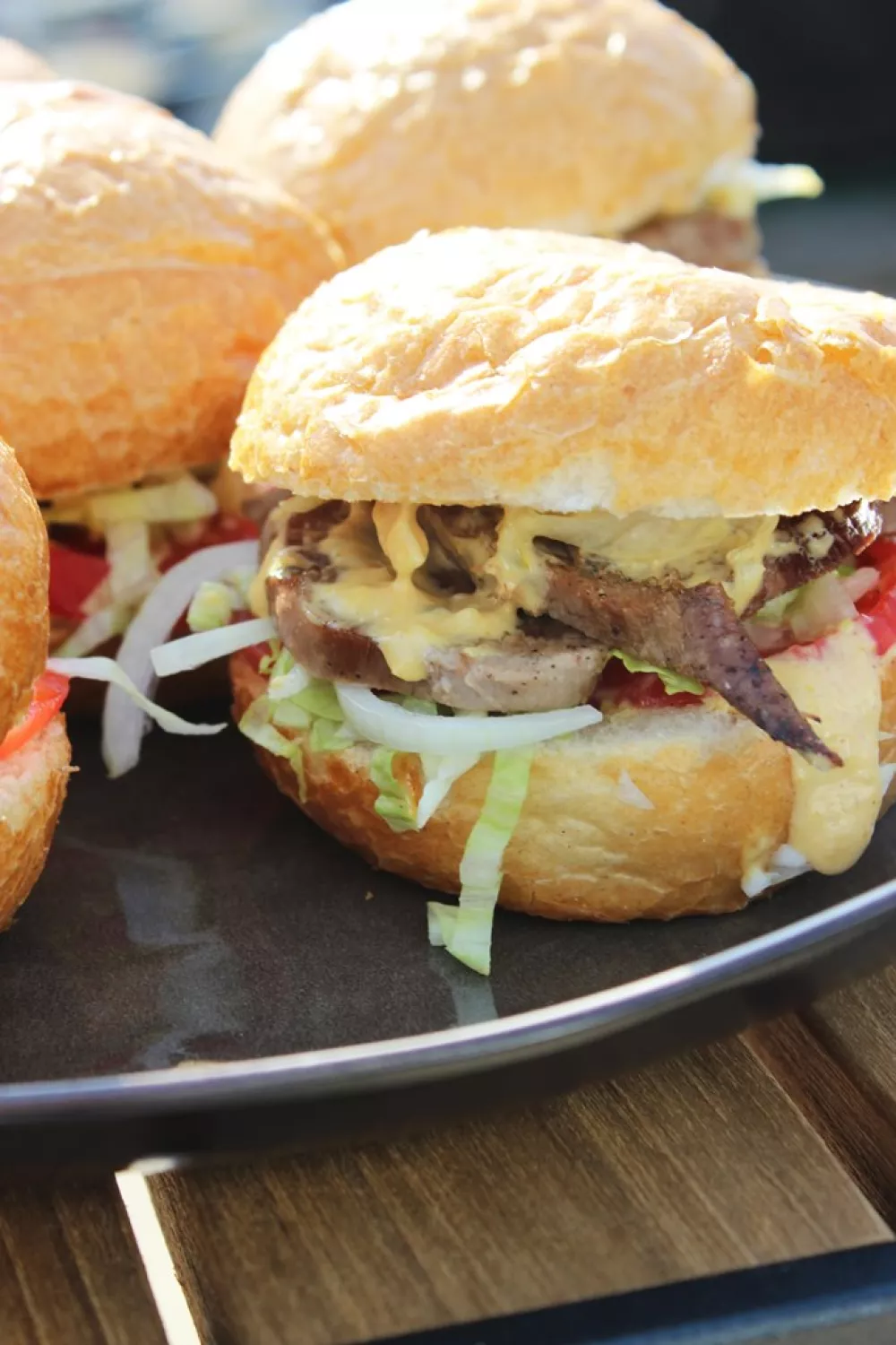 Snij de broodjes open, beleg ze met ijsbergsla, een schijfje tomaat en een ringetje ajuin. Leg hier bovenop enkele plakjes kalfstong en werk af met de saus.
