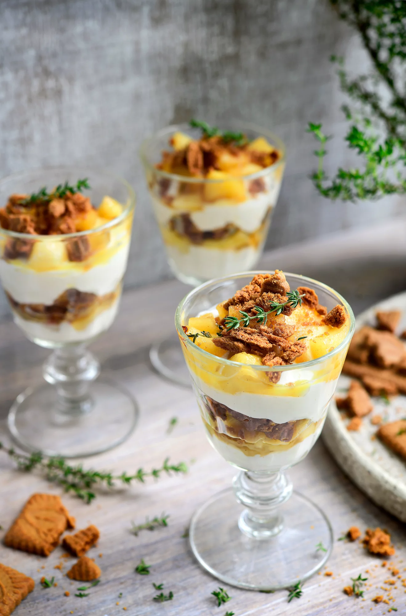 Verkruimel de speculaaskoekjes. Maak laagjes van hangop, gebakken appel en speculaaskoekjes in mooie glaasjes. Werk af met verse tijm.