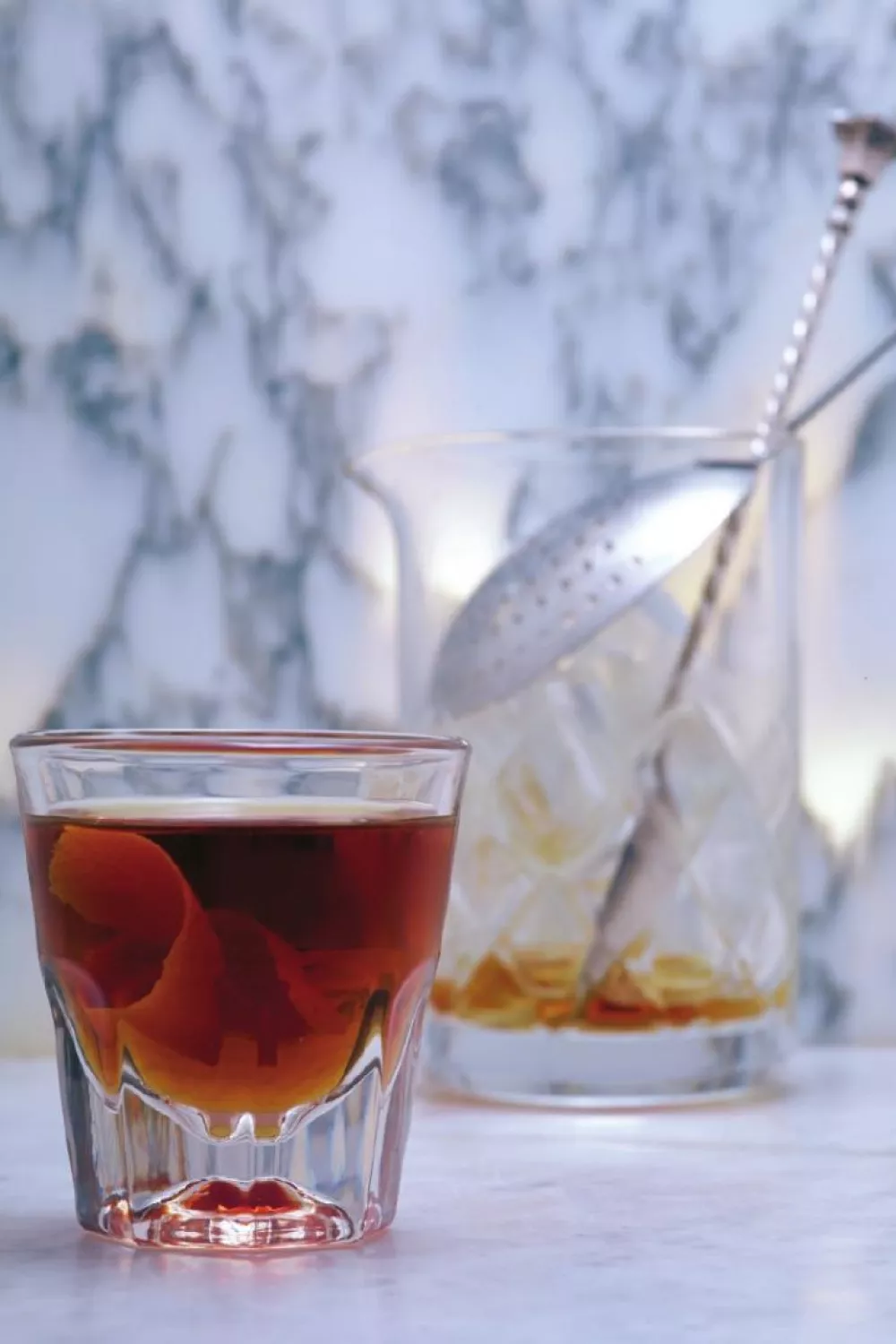Doe de ingrediënten, met uitzondering van de sinaasappelzeste, in een met ijsblokjes gevuld mixglas.