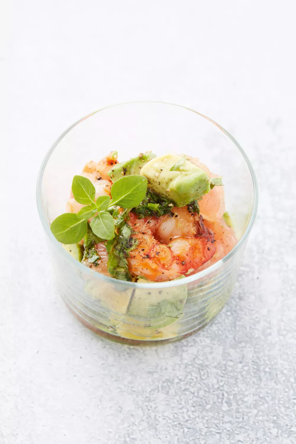 Leg de scampi’s op de avocado en werk af met de dressing.