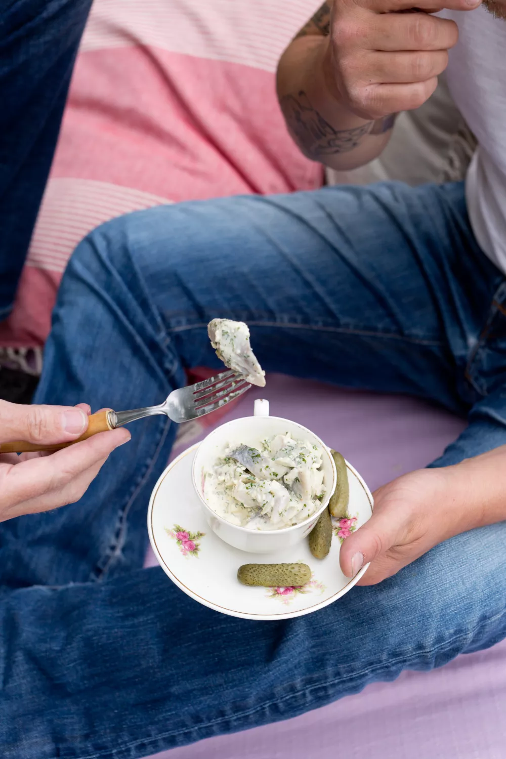 Voeg aan de tartaarsaus wat azijn en uienringen uit de haringenbokaal toe.