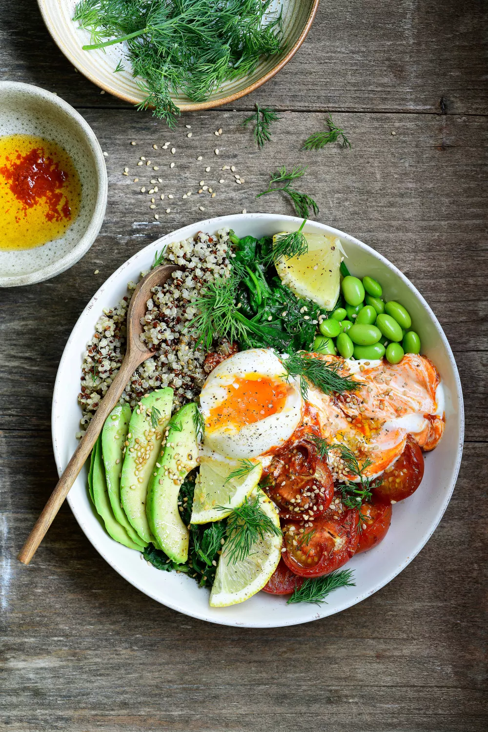 Verdeel alle ingrediënten over bowls. Pel de eitjes en leg ze er bovenop. Werk af met stukjes citroen, verse dille, geroosterde sesamzaadjes, peper en zout.