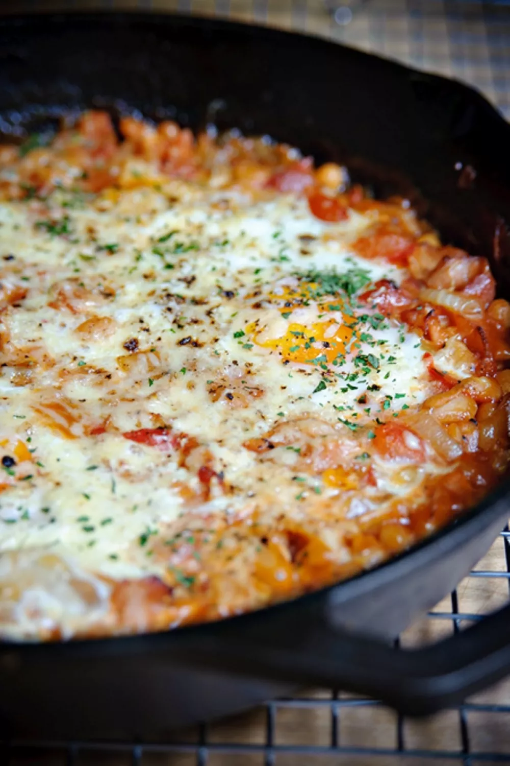 Deze hartige ontbijtschotel combineert romige eieren met krokant ontbijtspek, sappige tomaat, witte bonen in tomatensaus en gesmolten jonge kaas voor een rijke, troostrijke smaak. Je bakt het spek en de uien in een ovenvaste pan, voegt tomaat en bonen toe en laat de eieren in de oven zacht garen tot het eiwit gestold is. Perfect voor een gezellige weekendbrunch, snelle doordeweekse maaltijd of een knus ontbijt in koudere maanden.