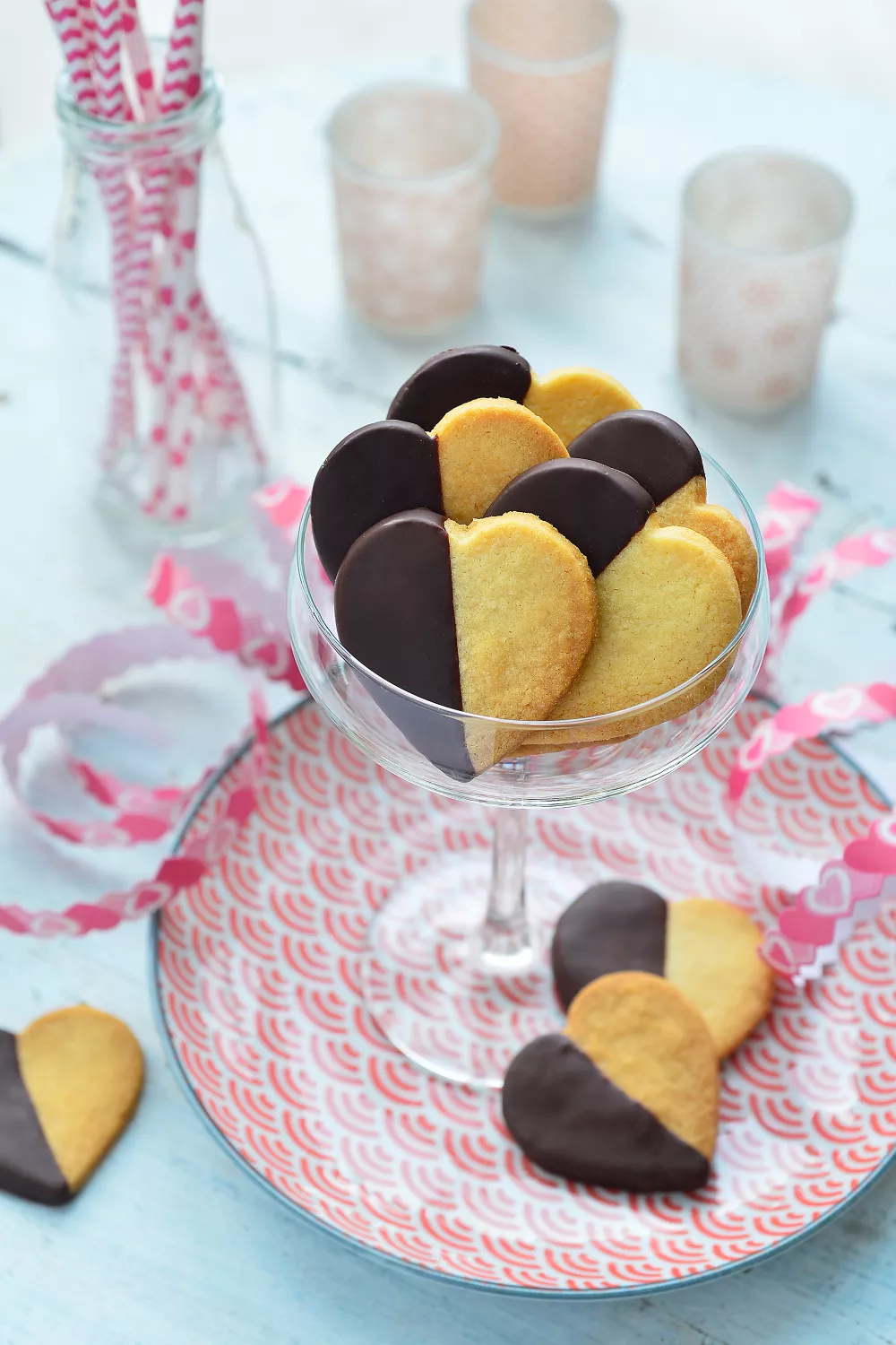 Deze klassieke hartjeskoekjes met romige boter en pure chocolade zijn ideaal voor bij de koffie, als valentijnstraktatie of een gezellige winterse lekkernij. Het kneden met een keukenrobot en deeghaak, koel laten rusten in de koelkast en vervolgens uitrollen en uitsteken zorgt voor knapperige randen en een boterzachte structuur. Een halve dompeling in gesmolten pure chocolade maakt ze extra feestelijk.