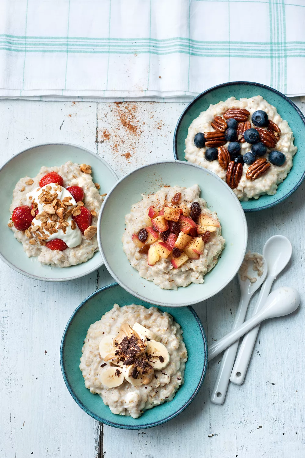 Deze romige havermoutpap met veelzijdige toppings brengt snel ontbijtcomfort op tafel: kies voor gekaramelliseerde pecannoten en blauwe bessen, appel met rozijnen, of banaan met pindaboter en pure chocolade. Met havervlokken, water en een scheut amandelmelk zet je op het vuur in enkele minuten een voedzaam ontbijtgerecht klaar, afgewerkt met kaneel en een drizzle honing of ahornsiroop. Perfect als doordeweeks powerontbijt of relaxte weekendbrunch, geschikt voor elk seizoen.