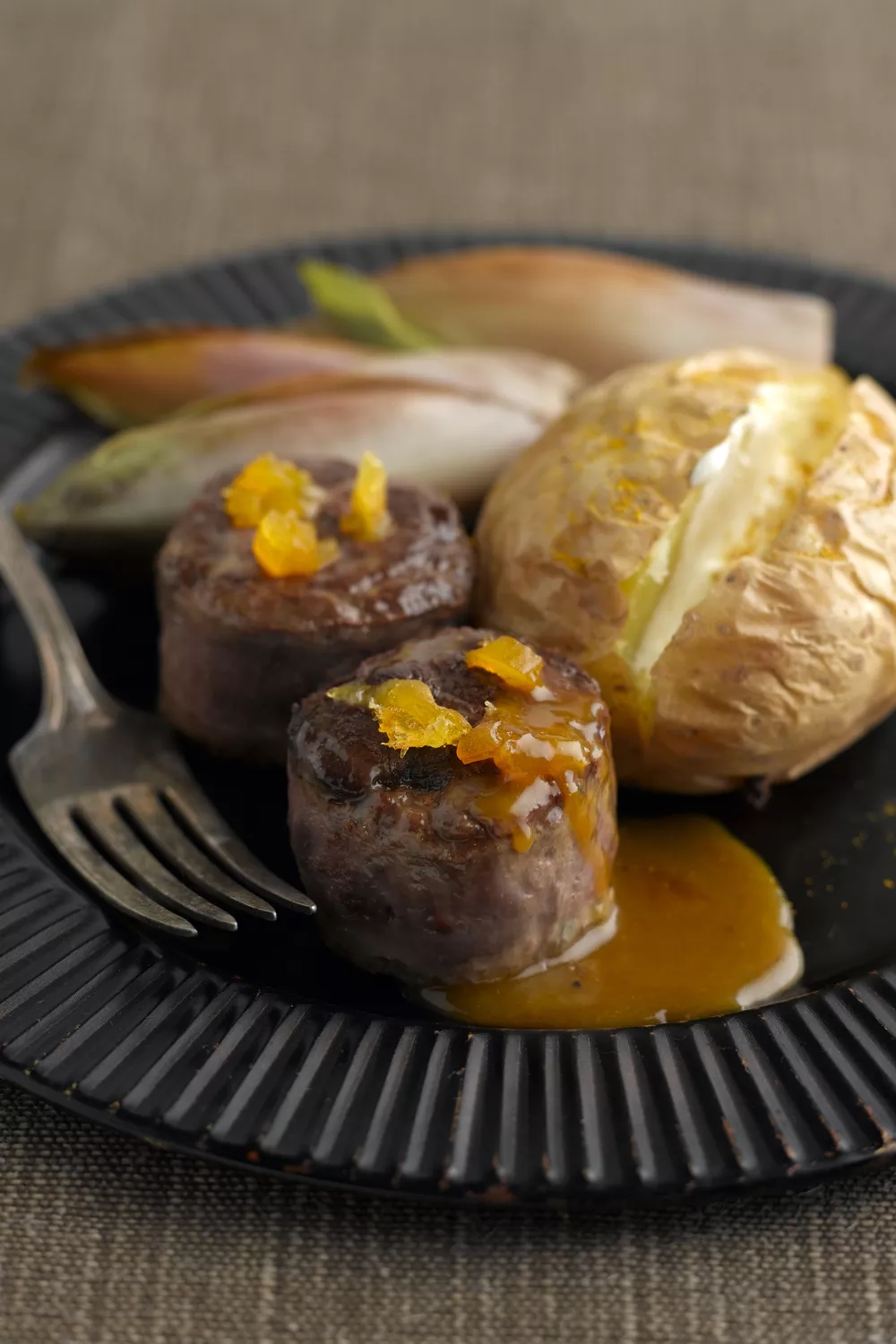 Verdeel over elk bord twee hazenrugmedaillons, één gepofte aardappel, drie stronkjes witlof en lepel de saus rond het witlof.