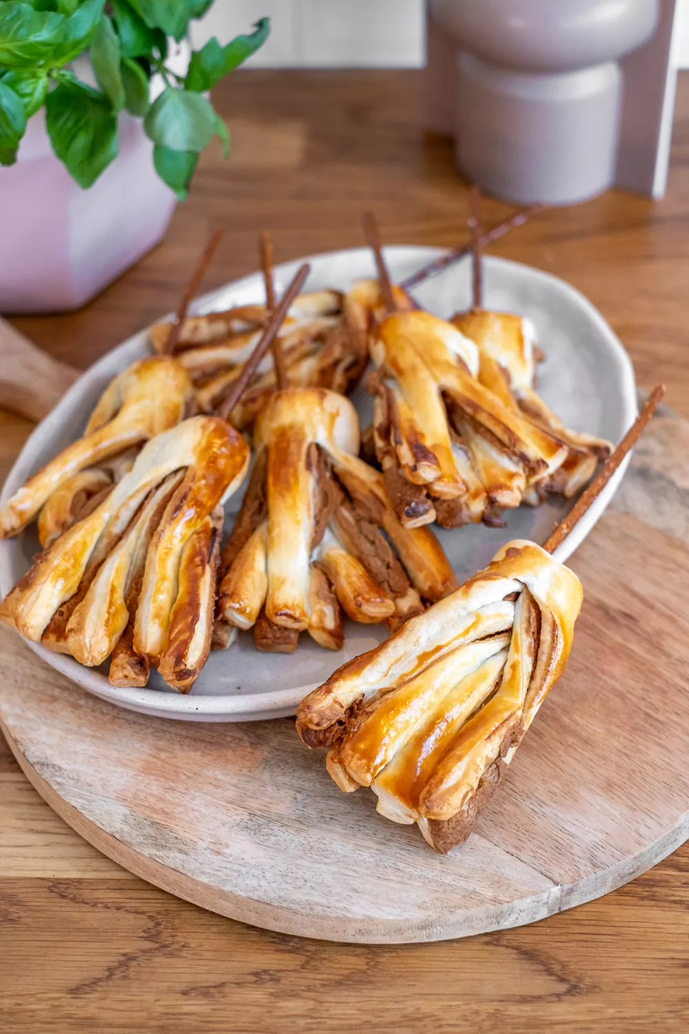 Knapperige heksenbezems van bladerdeeg en speculaaspasta, perfect voor Halloween, een herfstige borrel of als feestelijke snack. Rol het bladerdeeg op, bestrijk met speculaaspasta en wikkel om pretzelstokjes, bestrijk met eigeel en bak goudbruin. Het zoete speculaas en het zoute pretzel zorgen voor een heerlijk contrast.