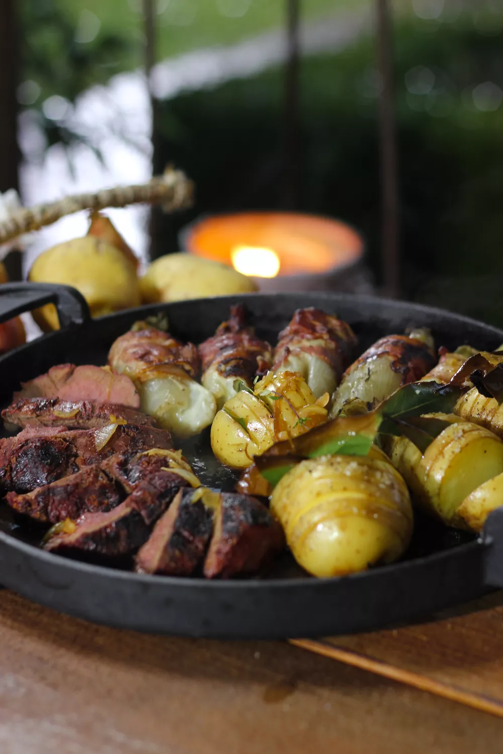Zacht hertengebraad met krokant gerookt spek en witloof gevuld met pecorino, gegrild op de barbecue voor een robuuste herfstachtige smaak. Serveer met in olijfolie geroosterde aardappelen en een ingekookte ajuinsaus van bruin bier en kalfsbouillon die het vlees complementeert. Perfect voor een feestelijk buiten diner of een gezellige wintermaaltijd met vrienden.
