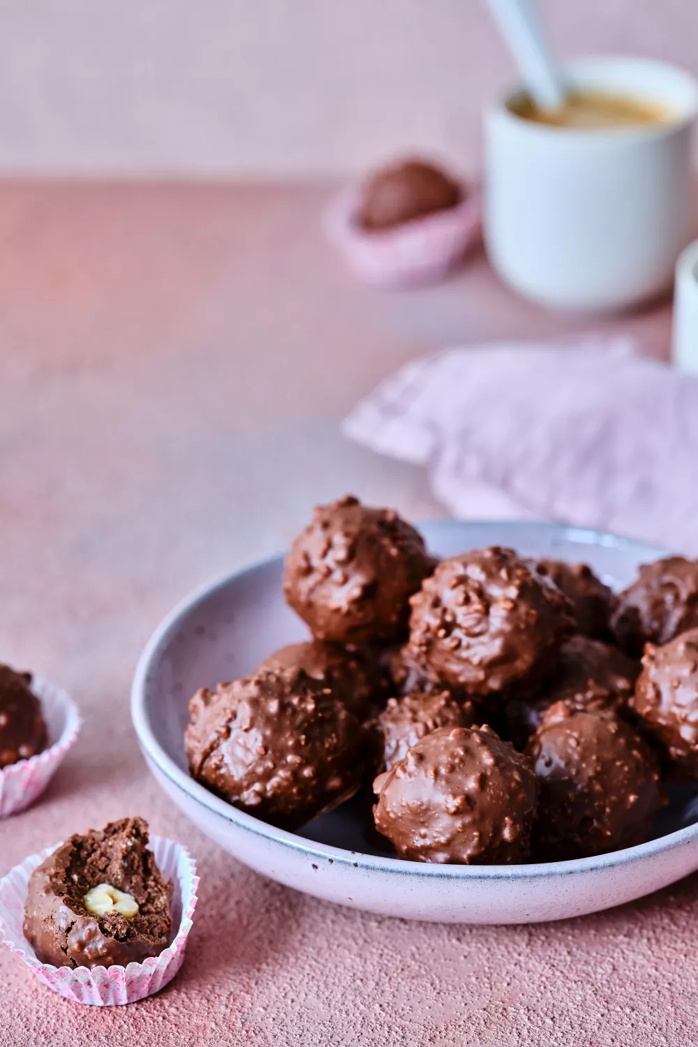 Luxe zelfgemaakte bonbons in Ferrero Rocher stijl met knapperige hazelnoten, krokante wafeltjes en romige chocopasta, omhuld met een laag zachte melkchocolade. Dit eenvoudige recept zonder bakken vraagt alleen hakken, opstijven in de koelkast en het dippen van de bolletjes in gesmolten chocolade. Perfect als feestelijke traktatie bij koffie, als huisgemaakt cadeau of voor de winterse kersttafel.