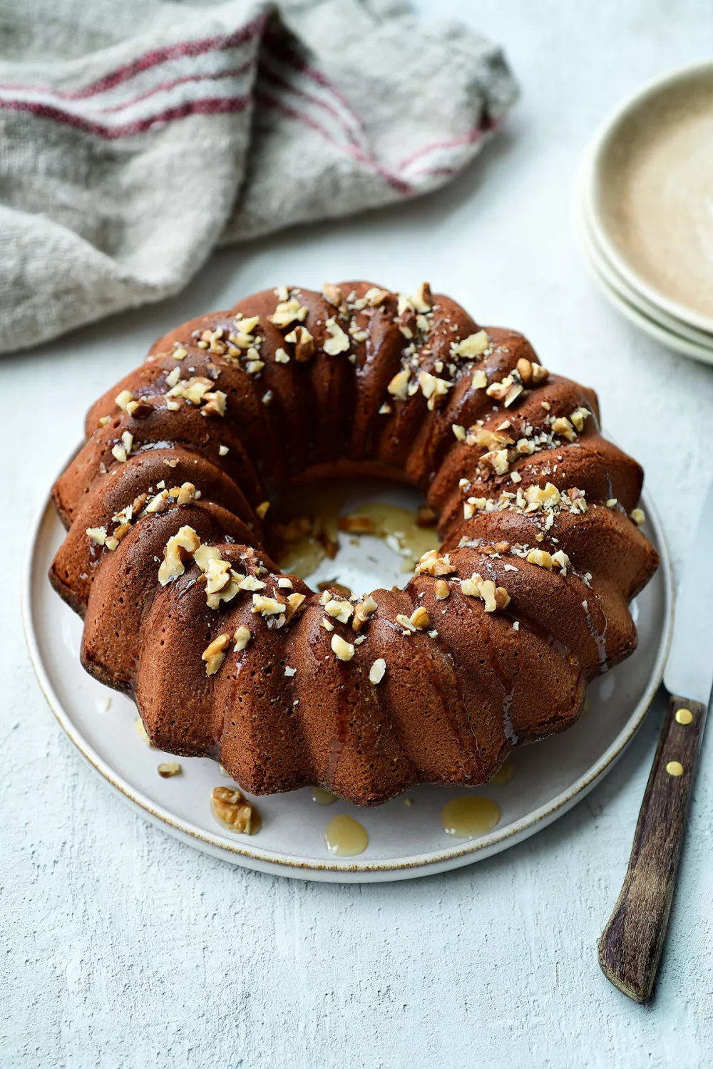 Haal de cake uit de oven en ontvorm. Hak de walnoten fijn. Bedruppel de cake met de rest van de honing en bestrooi met de fijngehakte walnoten.