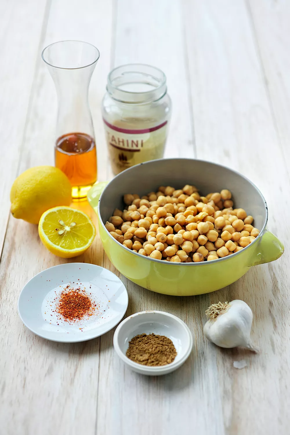 Mix de kikkererwten in een blender tot een glad mengsel met het sap van anderhalve citroen, de knoflookteentjes, sesamolie, olijfolie, sesampasta, cayennepeper, komijn en wat zeezout naar smaak.
