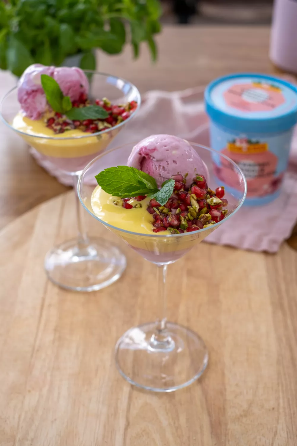 Neem mooie glaasjes en schep in elk glas twee bolletjes ijs. Lepel er wat van de sabayon over en werk nog af met de salsa van granaatappel en pistache. Serveer met een takje munt.