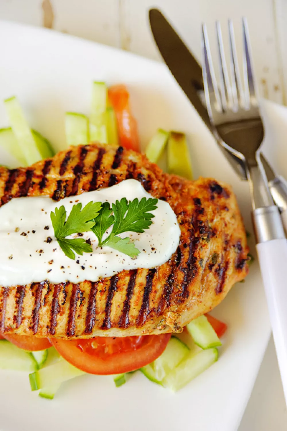 Deze Indiaas geïnspireerde kipfilet wordt zacht en smaakvol dankzij een yoghurtmarinade met tandoori kruiden en verse koriander. In een hete grillpan krijgt de kip in ongeveer acht minuten een licht geroosterde korst die goed combineert met komkommer en tomatensalade en warm naanbrood. Perfect als zomers barbecuegerecht of snelle doordeweekse maaltijd.