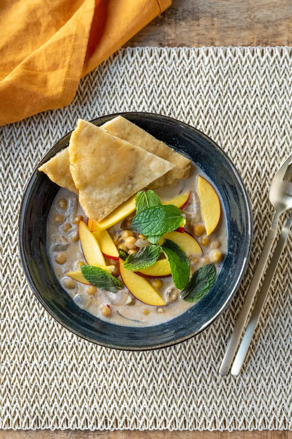 Romige, kruidige curry met kikkererwten en zachte stukjes nectarine brengt warme Indiase smaken en een frisse zomerse toets op tafel. Met kokosmelk, garam masala en een scheut limoen suddert de saus tot vol van smaak terwijl zelfgemaakte naan kort gefrituurd wordt voor extra knapperigheid. Perfect als snelle doordeweekse of feestelijke vegetarische maaltijd.