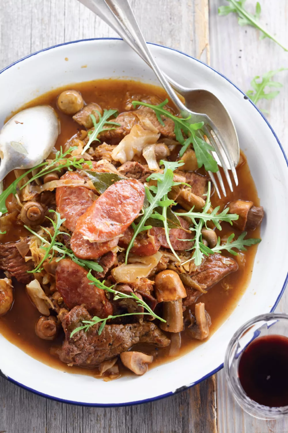 Deze traditionele jachtschotel combineert malse runderlapjes met aardse champignons, pittige zuurkool en hartige rookworst voor een warme, troostrijke stoofschotel. Door het vlees eerst kort te bakken en vervolgens uren te laten sudderen in rode wijn en bouillon ontwikkelt zich een diepe, volle smaak die uitstekend past bij stevig bruin brood op koude avonden. Perfect als familiegerecht in herfst en winter met herkenbare, huiselijke smaken.