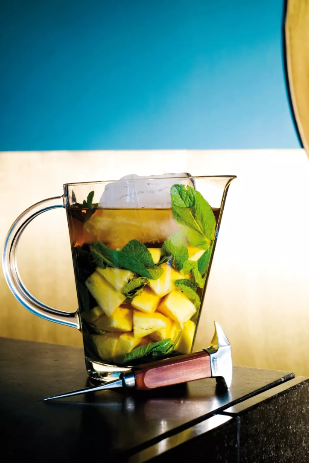 Neem een grote glazen karaf en doe er 1/4 van de muntblaadjes in. Kneus ze met de rietsuiker. Snijd de ananas in blokjes en leg dan een laag op de munt. Herhaal dit met de munt zonder te kneuzen en zo ook weer met de ananas, tot de karaf vol is.