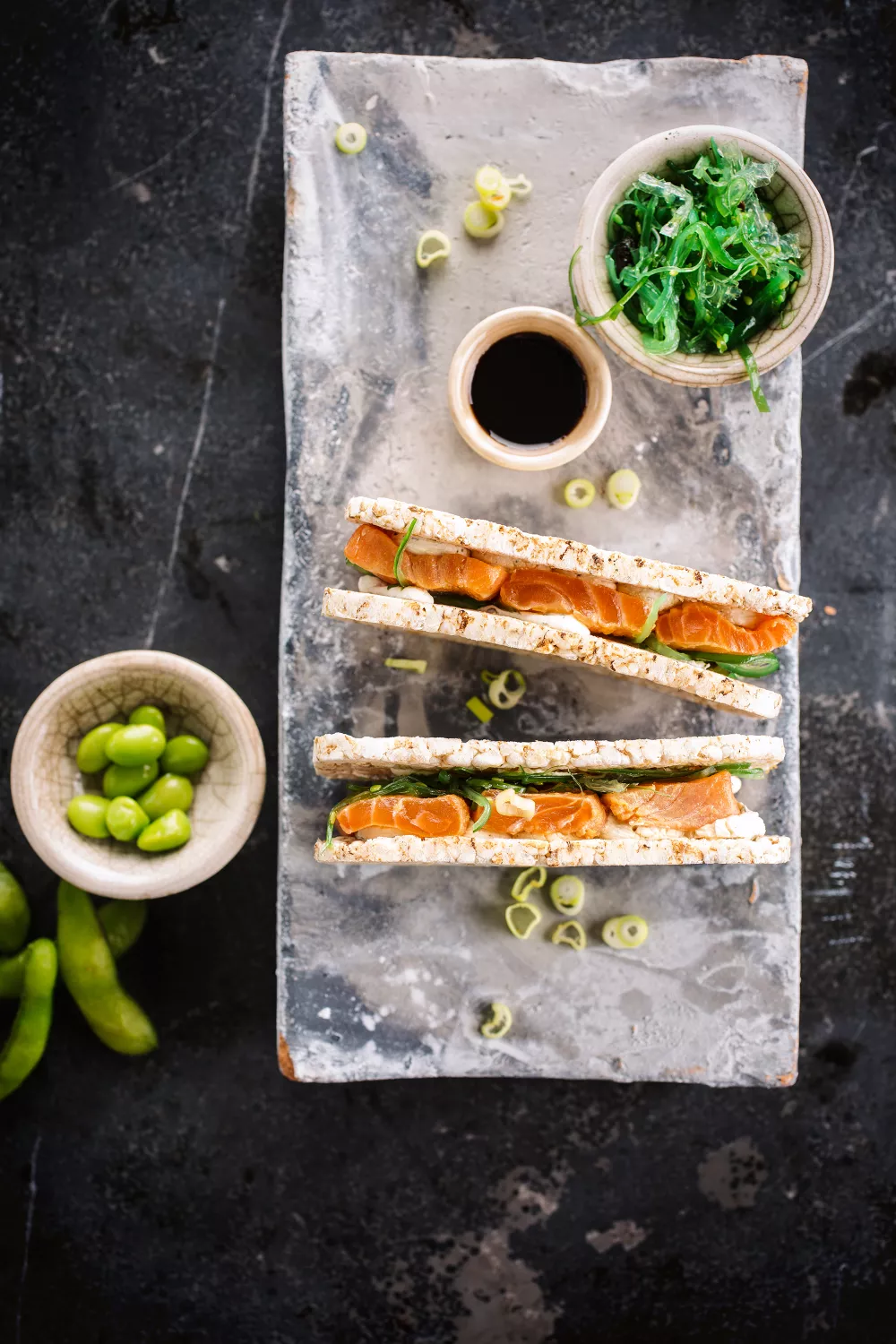 Een knapperige Japanse croque met verse zalm en pittige wasabiroomkaas brengt de pure smaken van sushi naar je lunch of borrel. De kort gemarineerde zalm in sojasaus en limoensap combineert met wakamesalade en geraspte gember voor frisse umami. Smeer wasabiroomkaas op rijstwafels, beleg met zalm en wakame en serveer met een edamameslaatje voor een snelle, lichte maaltijd.