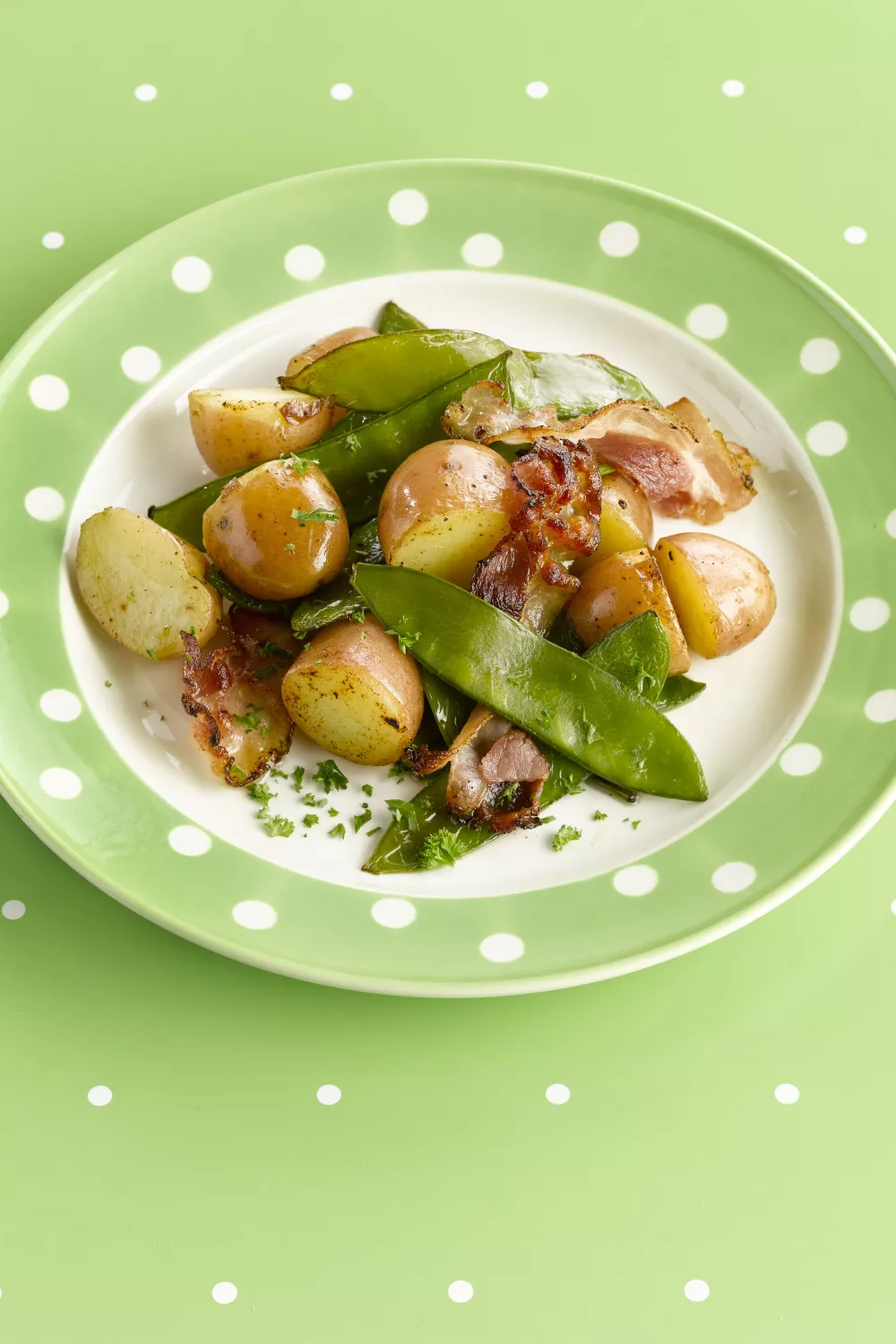 Een frisse, lenteachtige wokschotel met jonge aardappelen, knapperige peultjes en krokant katenspek, ideaal als snel bijgerecht of lichte maaltijd. In een hete wok worden de peultjes met pancetta kort geroerbakt en daarna komen de voorgekookte, gehalveerde aardappelen erbij voor extra textuur en hartige smaken. Een scheut olijfolie, flinke zwarte peper en verse peterselie maken dit eenvoudige seizoensgerecht af.