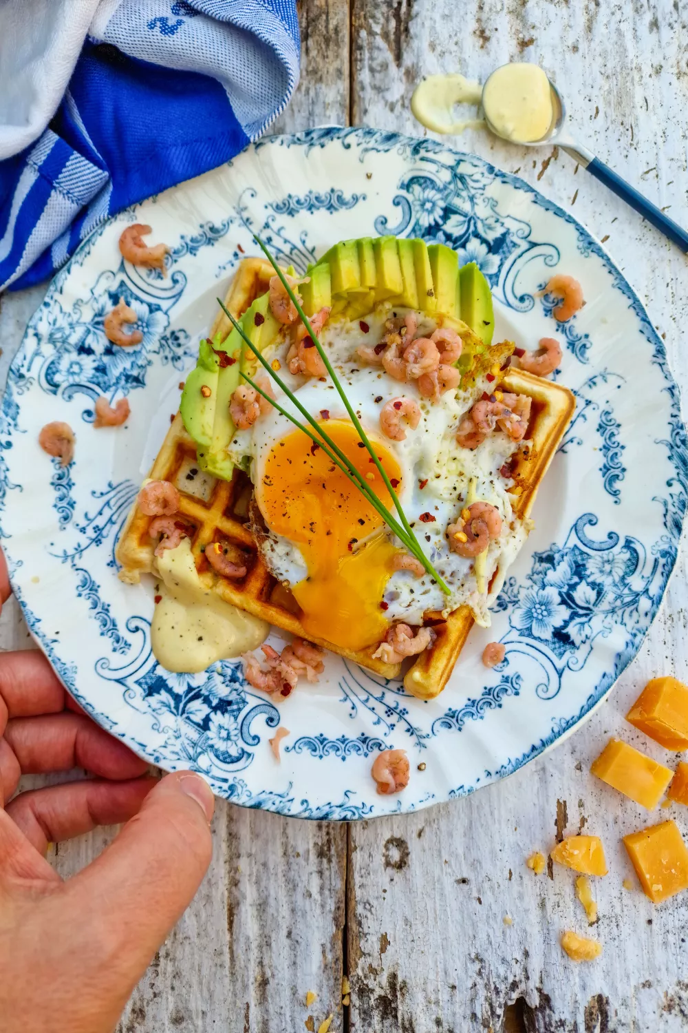 Verhit het wafelijzer en vet in met boter. Bak de wafels mooi krokant. Serveer onmiddellijk met avocadoschijfjes, een ei, hollandaisesaus, werk af met chilivlokken, noordzeegarnaaltjes en bieslook.