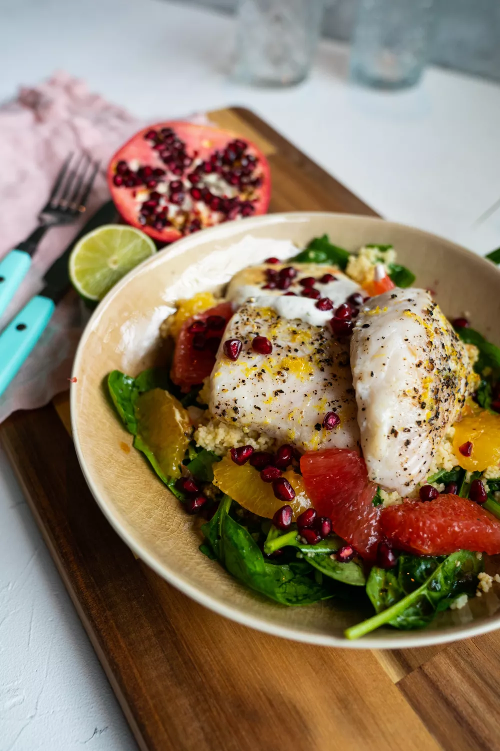 Zachte ovengebakken kabeljauw op een frisse couscoussalade met jonge spinazie, citruspartjes en granaatappelpitjes vormt een lichte, feestelijke maaltijd voor lente en zomer. Limoen en citroenzeste, een romige Griekse yoghurtdressing en een scheutje kandijsiroop geven een verfijnde zoetzuur balans, terwijl de couscous snel met kokend water wordt klaargemaakt. Simpele ovenbereiding en het à vif snijden van pompelmoes en sinaasappel zorgen voor een kleurrijk en fris bord.