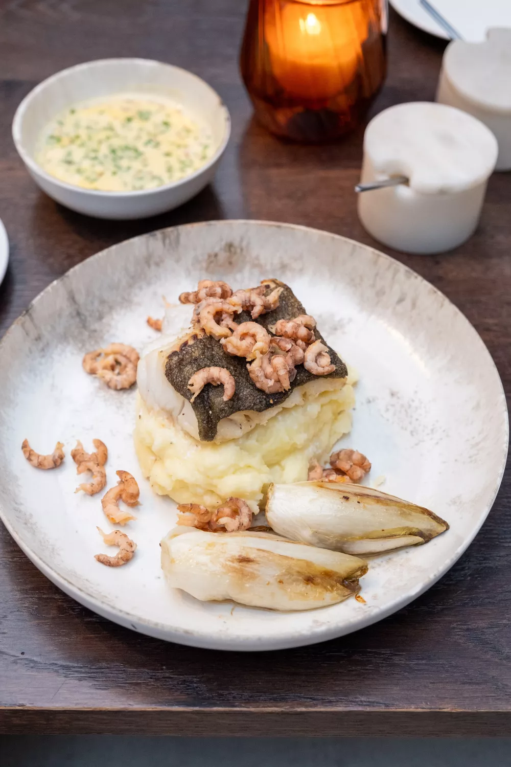 Schik telkens een flinke lepel aardappelpuree en twee stronkjes witloof op een bord. Schep er een kabeljauwhaasje bovenop en bestrooi rijkelijk met de handgepelde grijze garnalen. Werk de saus af met fijngehakte peterselie en serveer apart.