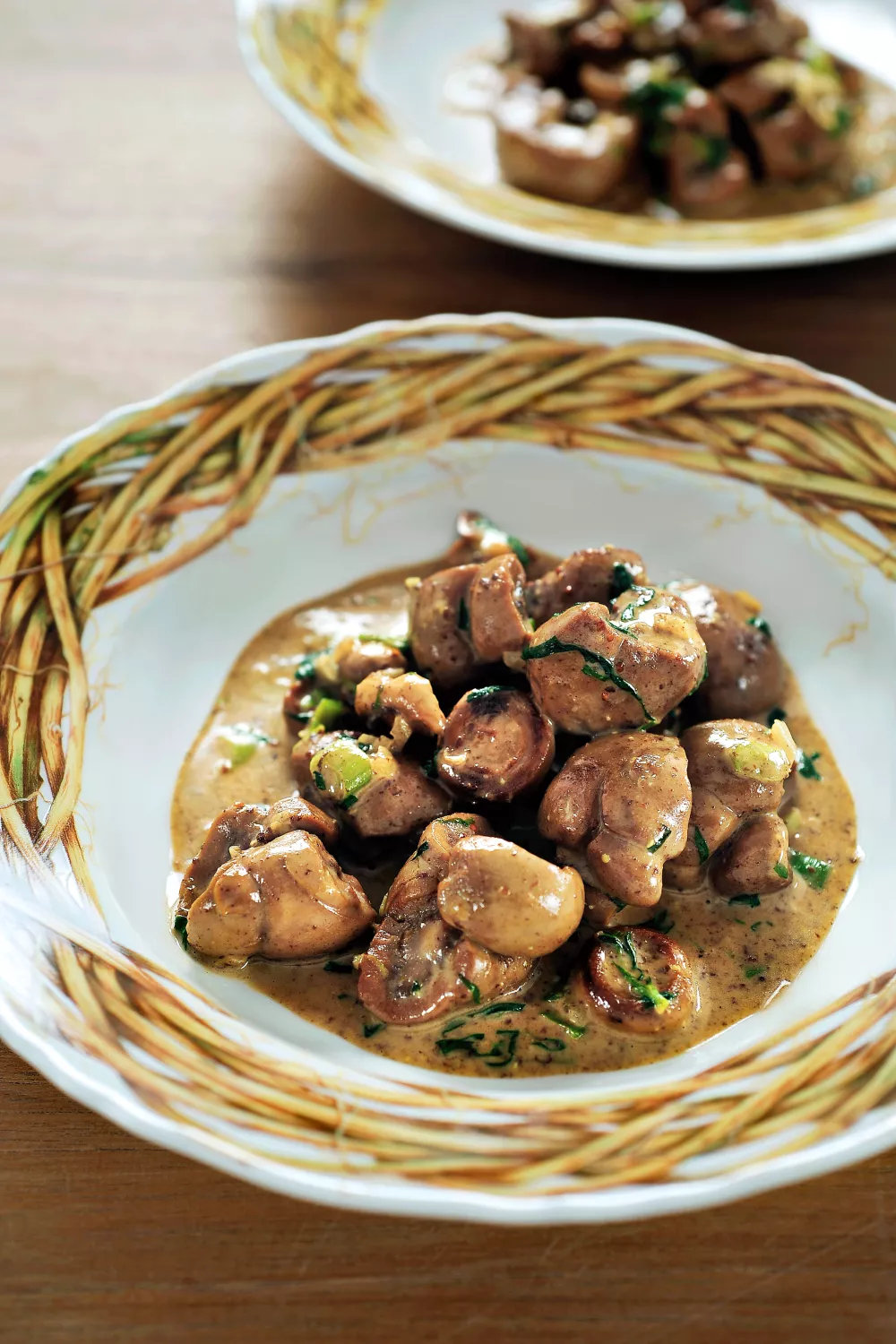 Zachte kalfsniertjes in een romige Madeirasaus met botergebakken champignons, lente-uitjes en verse dragon vormen een elegant hoofdgerecht, ideaal voor een feestelijk diner of een verwarmende herfstmaaltijd. De niertjes worden kort aangebakken en daarna sudderend gegaard terwijl fonds en Madeira ingekookt en gezeefd worden tot een fluweelzachte saus. Serveer met aardappelpuree of een frisse salade.