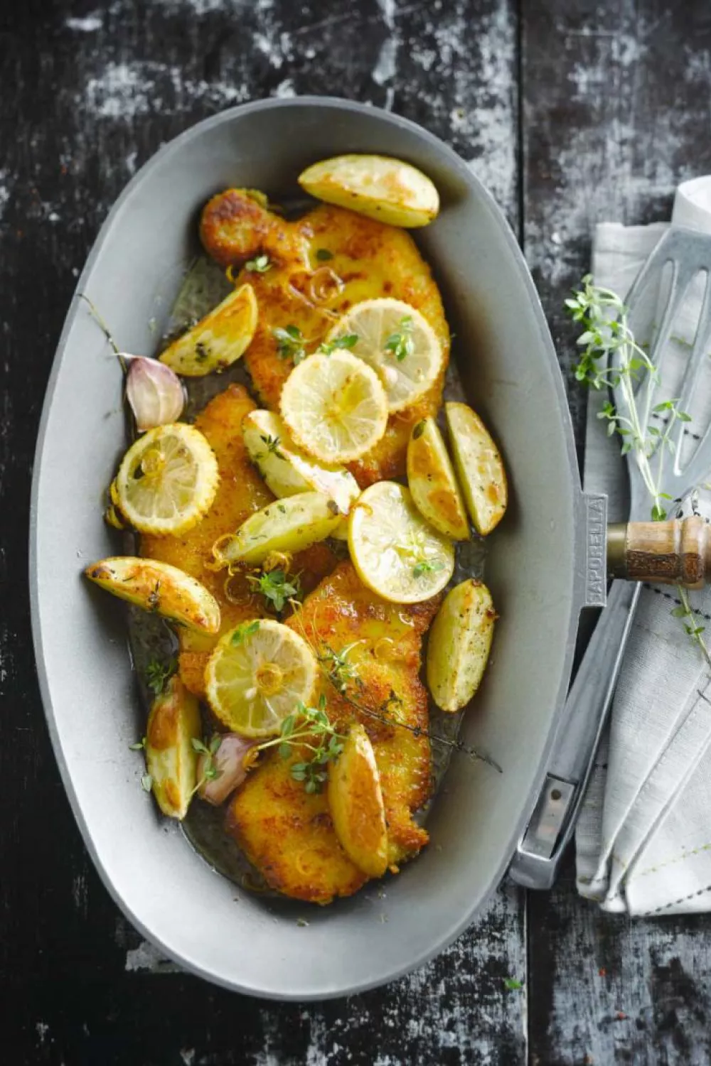 Knapperige kalfsschnitzels met een frisse citroensaus en goudbruine, met tijm geroosterde aardappelparten: eenvoudig paneren en bakken gecombineerd met ovenroosteren voor een smaakvol resultaat. Het krokante paneerlaagje contrasteert met mals kalfsvlees, terwijl boter, citroenrasp en peterselie zorgen voor een aromatische, lichtzure touch. Ideaal voor een gezellig familie-etentje of een zomerse maaltijd.