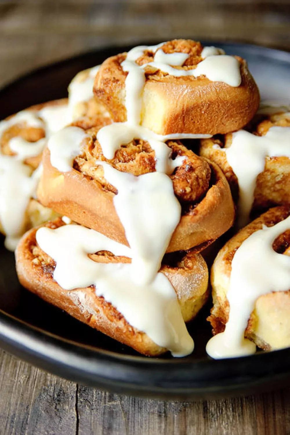 Rol het deeg op en snijd in 16 plakken. Leg deze in een licht beboterde ovenschaal. Dek af met een propere theedoek en laat anderhalf uur rijzen. Meng ondertussen de roomkaas met de poedersuiker, vanille extract, melk en boter en roer dit goed door.