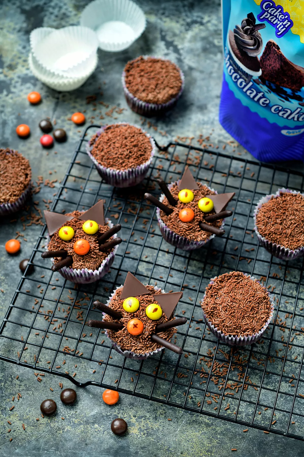 Besmeer de afgekoelde cupcakes met een laagje chocopasta en dip ze in een bord gevuld met chocolade hagelslag. Werk ze daarna af met chocolade driehoekjes (oortjes), chocoladepastilles (oogjes) en chocolade stokjes (snorharen) om er kattengezichtjes op te maken.